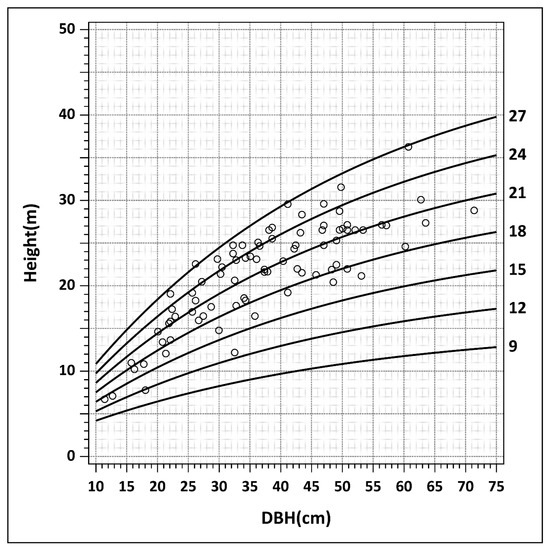 Red spruce site index curves developed from a Meyer two-parameter height model of (DBH, Height) pairs. Individual lines are base age 50 site index curves. Open circles represent sample trees (n = 83).