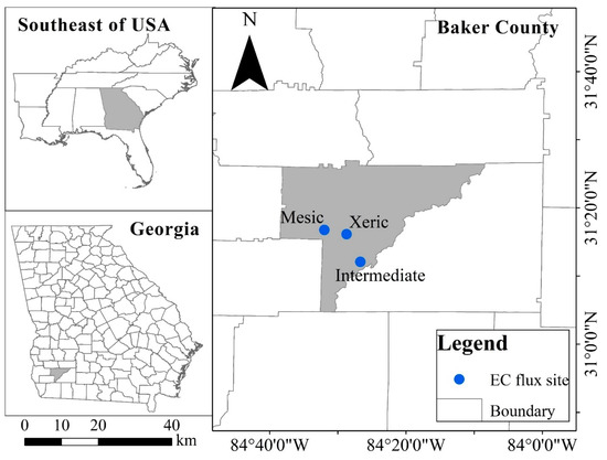 The study was conducted at the Jones Center at Ichauway (JCI) in southwestern Georgia, USA, using data from three sites collected during 2009–2017. The 11,000-hectare JCI property (31.22° N, 84.47° W; Figure 1) has a relatively flat terrain with long-term average annual precipitation of 1310 mm; air temperature ranges from −3 °C to 23 °C in winter, and 16 °C to 31 °C in summer [37]. The regional climate is classified as subtropical. All three sites are maintained by frequent low intensity fire on a two-year return interval (odd-numbered years; Table 1) [36]. Due to the differences in soil water holding capacity and land use legacy, the sites have different understory vegetation composition (Table 1) [38]. The mesic site lies on somewhat poorly drained sandy loam over sandy clay loam and clay textured soils [39]. Soils at the intermediate site have a depth to the argillic horizon of approximately 165 cm and are well-drained [39]. The xeric site lies on well-drained deep sandy soils with no argillic horizon [39]. All sites are situated within 10 km of each other (Figure 1), with heights above sea level of 65 m for the mesic site, 55 m for the intermediate site and 60 m for the xeric site. Inside the flux footprint area of the three EC flux towers, long-leaf pine trees (Pinus palustris Mill.) are the dominant woody plants, averaging 100 years of age, and understory vegetation includes shrubs such as Diospyros virginiana L and Aristida stricta Michx [40].