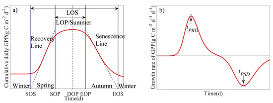 Schematic diagram of annual ecosystem-scale phenological process characteristics derived from measured cumulative daily gross primary production (GPP). (a) A(t) is the fitted curve shown in red, and the recovery line (ARL(t)) and the senescence line (ASL(t)) are shown as black dotted asymptotic lines on the left and right, respectively. (b) k(t) is the fitted curve shown in red, where tPRD denotes peak recovery day (d), and tPSD denotes peak senescence day (d) [26].
