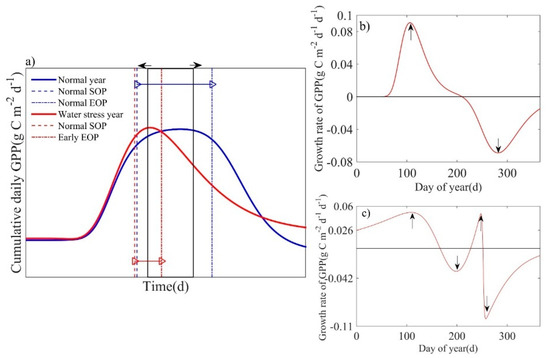 Schematic diagram of: (a) pattern of modeled cumulative daily GPP, solid black rectangle represents the standard length of peak (LOP) threshold (60 d), blue double-headed arrow indicates the normal LOP (>60 d), and the red double-headed arrow indicates the water-limitation induced short LOP (<60 d); and characteristic GPP growth rate in (b) normal year (2013) (black arrow point at the local extrema), with one maximum and minimum peak value (0.09 and −0.06 g C m−2 d−1 d−1, respectively), and (c) short-term, summer drought year (2010), with multiple maximum and minimum peak values.