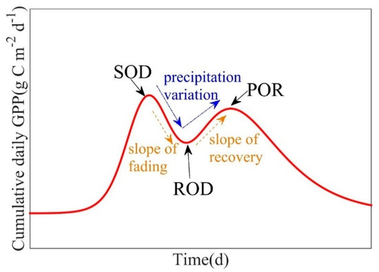 Schematic diagram of summer phenological process after short-term, summer drought. SOD = start of disturbance (d), when modeled GPP starts to decline after the spring peak; POR = peak of recovery (d), when modeled GPP reaches peak recovery; ROD = recovery day of disturbance (d).