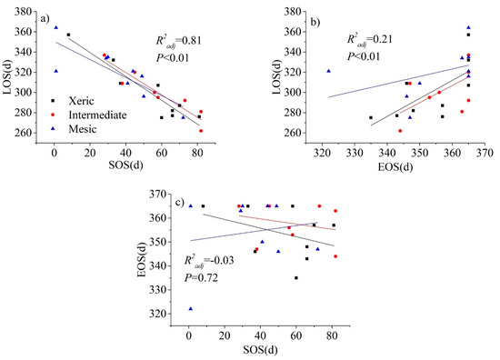 The relationship between SOS and LOS at all sites was significant and negative (Figure 6; p < 0.01); earlier onset of SOS was associated with a significant extension in LOS. The relationship between EOS and LOS was significant and positive for all sites (p < 0.01), with a delay of EOS associated with a significant extension in LOS. On the other hand, there was no significant relationship between SOS and EOS; that is, SOS and EOS jointly control LOS across the sites, but SOS and EOS were independent of each other, with their own response mechanisms to environmental and human activities.