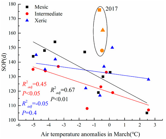All study sites experienced a severe, but short-term drought in March 2017; although there were no extreme air temperature events during that month (16.5, 16.7 and 16.7 °C, respectively), precipitation was 12.95, 13.97 and 11.17 mm mo−1 for mesic, intermediate, and xeric sites, respectively (Appendix D, Figure A4). This resulted in anomalously high values of SOP during this year at all sites (Figure 7). Excluding this short, severe drought event, we found that as March air temperature anomalies increased, the SOP was significantly advanced in the mesic and intermediate sites, but there was no similar pattern in the xeric site. Due to this 2017 drought event, the SOP was delayed by 176, 148, and 162 d, at the mesic, intermediate, and xeric sites, respectively (Figure 7).