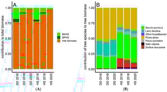 Relative contribution of biomass of annual herb shoots (BAHS), biomass of perennial herb shoots (BPHS), and tree biomass to total biomass (A) and tree species to tree biomass (B) in the DD and HS transects in 2016, 2018, and 2020. Values and statistical significance of temporal differences are shown in Table 3.