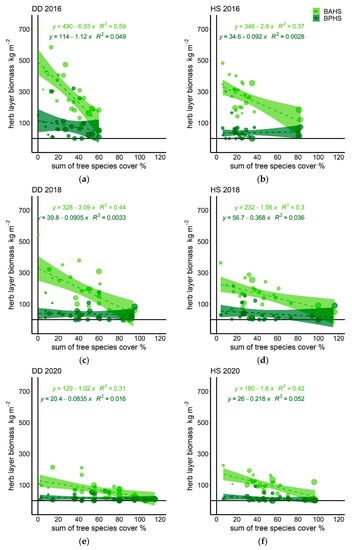 Relationship between herb layer biomass (all species except for trees) and sum of tree species cover at transects (DD and HS) within sampling periods expressed by linear regressions (respective equations are presented at the top of each graph, where x is the sum of tree species cover, and y is the herb layer. Explanations: (a) DD, Year 2016, (b) HS, Year 2016, (c) DD, Year 2018, (d) HS, Year 2018, (e) DD, Year 2020, (f) HS, Year 2020.