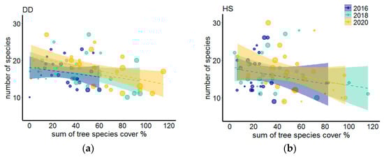 Relationship between number of all plant species recorded at 4 × 4 m plots and sum of tree species cover at the transects (DD and HS) in sampling periods expressed by linear regressions. Point size is scaled by tree biomass. Different colors are used for sampling periods. Shaded areas represent 95% confidence intervals around regression models. Explanations: (a) transect DD, (b) transect HS.