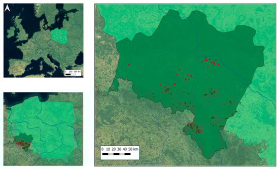 Area of investigation. Red dots represent analyzed relevés of the Scots pine forest in SW Poland.