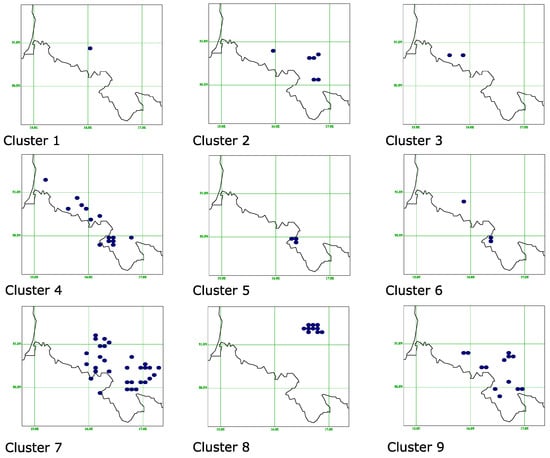 Diagnostic species were determined using the Φ coefficient as a measure of fidelity for clusters of equalized size [,,]. Species with Φ ≥ 20 (0.10 × 100), constancy ≥ 20%, constancy ratio [] higher than 1.5 and significant concentration in a particular cluster, tested by the Fisher’s exact test (p < 0.05), were considered to be diagnostic. A species was considered diagnostic for more than one cluster with the Φ > 20 (0.2 × 100) in at least two clusters, regardless of the constancy ratio. Species with constancy ratio < 1.5 and Φ > 20 in only one cluster were not considered diagnostic. Constant species were defined as species with frequency of at least 60% in a cluster. Distribution maps of the recognized clusters were prepared using DMAP software [].
