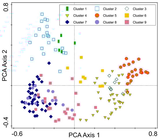 The vegetation types were identified using a modified TWINSPAN algorithm [] with Total Inertia measure of heterogeneity using JUICE software []. The obtained number of clusters coincided with the results of crispness analysis [], suggesting the division of relevés into nine groups.