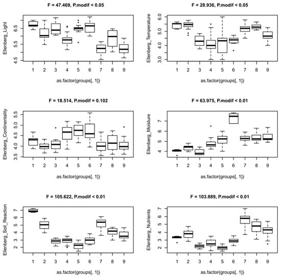 Summary box-and-whisker plots of mean Ellenberg’s indicator values (EIVs) for clusters recognized within Scots pine forests of the Sudetes and their foreland (SW Poland) produced by one-way ANOVA. The central line of each box indicates the median value; box boundaries the lower (25%) and upper (75%) quartiles; and whiskers the range of values. P.modif was calculated using a modified permutation test of significance for analysis of mean Ellenberg indictor values (EIVs); F—test statistic. Numbers of clusters are the same as in Figure 2.