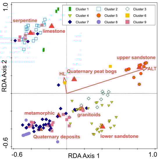 In order to identify ecological conditions of the pine forests within the study area, different environmental variables were analyzed. Altitude (measured in m a.s.l. and divided by 1000 to standardize value), heat load [] and bedrock type were used as explanatory variables. The bedrock type at each site was obtained from a Detailed Geological Map of the Sudetes mountains. (Polish Geological Institute, National Research Institute, http://sudety.pgi.gov.pl/). Based on the criterion of mineral composition and major geological processes [], nine categories of rocks were proposed as explanatory variables: Quaternary deposits (sands, clays and gravels), Quaternary peat bogs, serpentines, limestones, metamorphic rocks (gneisses, schists, mud- and claystones, greywackes, Paleozoic conglomerates), granitoids, trachytes and two kinds of sandstones—very different in terms of their properties. The first one labelled as Upper Jointed Sandstone of Late Turonian/Coniacian age [] is subjected to very slow weathering processes; therefore, only initial podzols derive from it. The second one labelled as Lower Jointed Sandstone (Coenomanian/early Turonian) has got structures that are more prone to weathering; thus, deeper podzols and even cambisols derive from it. Heat load index (HL), is a direct measure of incident radiation calculated from slope inclination, aspect and latitude [].