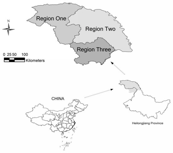 The study site is located to the north of Daxing’anling Mountains in the Heilongjiang and Inner Mongolia provinces of Northeast China (from 50°04′ N to 53°32′ N and from 121°50′ E to 127°00′ E). This region covers an area of 84,600 km2 and is among the main areas producing high-quality wood in China. The natural secondary forest of Dahurian larch (Larix gmelinii) is the major forest type here. Elevation ranges from 400 to 1000 m, with a continental climate. The average annual precipitation is from 360 to 550 mm, of which 80% occurs in the summer. The average annual temperature ranges from −1.2 to −5.6 °C. The study area was assigned to three distinct regions [35]. The northwest and the southeast of the northern slope of Yilehuli Mountain are designated as regions one and two, respectively. The eastern slope of the northern part of Daxing’anling Mountain is described as region three (Figure 1).