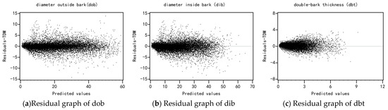 Figure 2 displays a set of the residual graphs to visually present the fitting effects of additive systems for dob, dib and dbt with TDM methods. The residuals were randomly distributed and the data points did not show error trends. The parameter estimation for the taper equation systems of the six methods are listed in Table 4. All parameters were significant (p < 0.0001), including the estimates of dummy variables λi, which indicated that there was a significant difference in the taper equation systems among the three regions.
