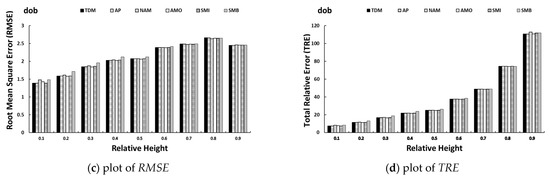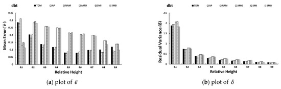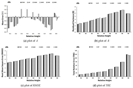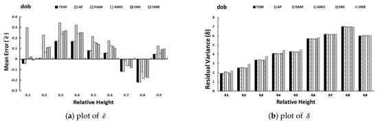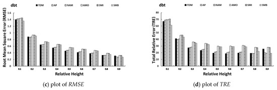 Figure 5 shows that additive models of dbt with the TDM method slightly outperformed other models in terms of , RMSE, and TRE for most relative height classes (0.3 = < rh < 0.8), and the model with the SMB method also outperformed other models in terms of , , RMSE, and TRE for lower section (rh = 0.1). All model structures underestimated values of dbt. These conclusions are consistent with Table 5.
