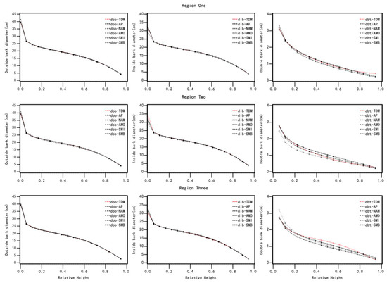 The six methods were subsequently used to describe the stem tapers in the three regions (Figure 6), each graph describing trees of the same size (i.e., same D and H), representing the average tree. There were no great differences, with graphs showing that all stem tapers for dob and dib were almost identical, and that these function plots had consistent trends, except for a slight difference in the lower section among the three regions. However, the graphs showed differences in the dbt curves across the six methods, and the predicted values of SMB for dbt were relatively smaller than those of other methods in region two at the interval (0.4 ≤ rh). The predicted values of TDM for dbt were relatively bigger to those of other methods in region three at the interval (0.5 ≤ rh ≤ 0.7).