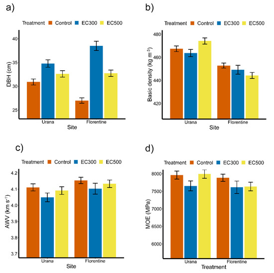 - Munoz, F.; Neira, A.; Cancino, J. The effect of thinning on the wood basic density of Eucalyptus nitens (Deane & Maiden) Maiden. Interciencia 2010, 35, 581–585. [Google Scholar]