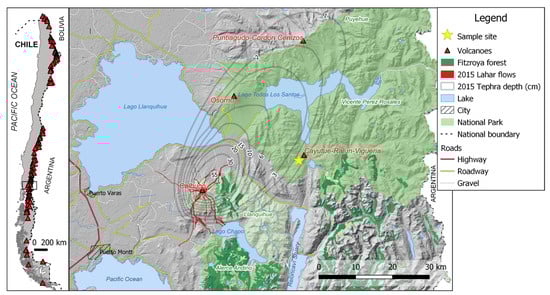 Map of study area indicating Calbuco volcano and the F. cuppressoides sampling site. The lahar flows and tephra deposition (cm depth) during the Calbuco eruption of 2015 [] are indicated with red lines and isopachs, respectively. On the left is a map of Chile indicating the location of active volcanoes in red triangles.
