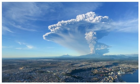 Calbuco is an active stratovolcano located in the Southern Andes volcanic arc, Northern Patagonia of Chile (41°20′ S/72°37′ W; 2,003 m a.s.l.), 30 km northeast of Puerto Montt (Figure 1). According to the Chilean Geological and Mining Survey, Calbuco ranks third in the specific risk classification of active volcanoes in Chile [], which is based on the dangers and exposure of human populations to eruptions of national volcanoes. This volcano has formed over the last ~300,000 years [], and the historical record (Table 1) indicates more than 11 eruptive cycles since AD 1792 [,], with an eruptive frequency of 19 years. The historical eruption record is detailed and reliable after 1853, when the nearby city of Puerto Montt was founded. These eruptive cycles mean volcanic activity periods are generally integrated by two or more eruptions (or explosions), and that their activity is effusive and explosive, with tephra dispersion mainly drifting northeast and east due to predominantly westerly winds. The eruptions are primarily of andesitic composition with violent sub-Plinian eruptive behavior that includes pyroclastic and lava flows, domes, spines, blasts and lahars []. The most recent eruption of the Calbuco volcano occurred in April 2015 (Figure 2); it was sub-Plinian, with a Volcanic Explosivity Index (VEI) of ~4 [,,]. It generated pyroclastic density currents, lahars, and tephra fall, causing many impacts in Chile and Argentina such as damage to infrastructure, and agricultural and livestock activities, as well as suspending regional air traffic for a few weeks []. The tephra mostly affected areas northeast of the volcano (Figure 1), such as the Ensenada village nearly 15 km away, which was covered by tephra deposits of 20–30 cm thick [].