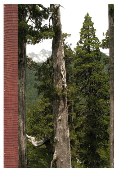 Fitzroya cupressoides, commonly known as Alerce, is an endemic and evergreen conifer tree species of temperate rainforests of Chile and Argentina. It can reach 5 m in diameter and up to 50 m in height, being the second longest-living tree species in the world, able to reach more than 3600 years old (Figure 3) []. It grows in Northern Patagonia, mainly in Chile (39°50’–43° S) along the Andes, the Coastal Range, and the Central valley between sea level and 1,200 m altitude []. The climate in the distribution range of F. cupressoides is a temperate humid oceanic type with a mild Mediterranean influence during summer, characterized by a high annual precipitation that varies from 2000 mm in the northern range and intermediate depression to more than 5000 mm above 700 m a.s.l. on the windward side of the mountains, where there is commonly snow during the winter [,].