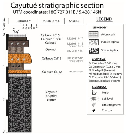 The F. cupressoides sampling forest was selected based on: (i) location east of the Calbuco volcano under the general tephra dispersion zone, due to persistently westerly winds, (ii) being composed by ancient F. cupressoides individuals in a region where this species has been historically heavily cut down, (iii) accessibility to the site in the Andean region. According to this, our sampling site was a forest located 28 km NE of Calbuco between 800 and 1000 m a.s.l., near the Cayutué Lake at 41°15′ S and 72°16′ W in the Vicente Pérez Rosales National Park and 60 km NE of the city of Puerto Montt in the Los Lagos District (Figure 1). The climate of the study area is described as a temperate rain climate with an annual precipitation of more than 5000 mm []. Temperatures vary seasonally from an average of 15.3 °C in January to 7.6 °C in July. Soil in the study area has poor drainage, composed of coarse and fine tephra from the Calbuco and Osorno volcanoes and the Cayutué eruptive center (Figure 4), and the slope in the study area is low to moderate. During the 2015 Calbuco eruption, it was estimated that 1–2 cm of ash fell in the area of our sampling forest, but in situ measurements made during our sampling determined an ash fall of 5 cm in thickness (Figure 1). Prior to the 2015 eruption, the soil of the Cayutué forest exhibited four separate tephra deposits from Calbuco from over the last 2000 years (Figure 4). The tephra deposits were associated with petrographic and geochemical characteristics of volcanic sources. The origins of tephra deposits were the Calbuco and Osorno volcanoes and a massive scoria sequence of the Cayutué eruptive center. Two orange deposits were correlated with Cal12 and Cal13 tephra units dated to 1800 and 1200 years BP, respectively [].