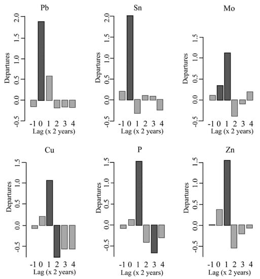 The concentrations of twenty elements from F. cupressoides tree rings covering 500 years over the period AD 1514–2016 (Be, B, Al, Si, P, Ti, Mn, Ni, Cu, Zn, Ge, Zr, Nb, Mo, Ag, Cd, Sn, Sb, Ba, and Pb) were used to determine the capability of chemical elements to act as tracers of past eruptions. The response of six chemical element concentrations (Pb, Sn, Mo, Cu, P, Zn) associated with historical records of eruptions clearly showed positive concentration anomalies during and after historical VEI ≥ 3 eruptions of Calbuco (Figure 5). These six elements were named as chemical tracers of past eruptions (TPEs) and were classified into (1) co-eruptive signals: Pb and Sn, which exhibited positive anomalies in the biennium of the eruptions, and (2) post-eruptive signals: Mo, Cu, P and Zn, which exhibited positive anomalies during the biennium following the eruptions.
