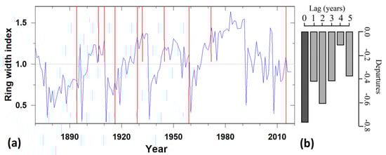 (a) The standard annual F. cupressoides tree-ring-width chronology of the Cayutué site during the period of the historical eruption record of the Calbuco volcano from 1850 to 2016 AD. Vertical long and short red lines indicate historical eruptions with a Volcanic Explosivity Index of ≥3 and =2, respectively, according to Petit-Breuilh [], Sellés and Moreno [] and the Global Volcanism Program []. (b) Superposed epoch analysis (SEA) comparing the F. cupressoides normalized treering index departures (z-scores) during the Calbuco eruptions of VEI ≥ 3 for the period 1786–2016 AD. The X-axis represents a set of 6 years (the eruption year and 5 years following it) and black bars represent the significant confidence level at 95% after 1000 Monte Carlo iterations.