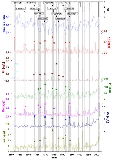 The Cayutué F. cupressoides dendrochemical (Sn, Pb, P, Mo, Cu, Zn) and ring-width chronologies. All registries have a biennium resolution. Vertical gray lines indicate the eruption dates of the Calbuco volcano during the historical period after 1850 (VEI ≥ 3 according to Petit-Breuilh [], Sellés and Moreno [], Global Volcanism Program []), and the possible dates of past eruptions during the 1514–1848 period inferred from the co-occurrence of concentration values of chemical TPEs above the 90th percentile of each chemical series for at least ≥ 2 chemical tracers, indicated by asterisks.