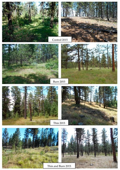 The Blue Mountains FFS site contains sixteen treatment units, ranging in size from 8 to 20 hectares []. Units were randomly assigned to one of four treatments, for a total of four replications of each treatment. Treatments included mechanical thinning, prescribed burning, a combination of thinning and burning, and a no-treatment control (Figure 1). The target basal area (BA) was 16 m2 ha−1, and the fine fuel loading target was ≤4.5 Mg ha−1 []. Thinning treatments took place after the initial measurement in 1998, consisting of a thin from below, with a preference for retaining large trees or snags and fire-tolerant species, specifically ponderosa pine. Residue from thinning remained on site. Units were broadcast-burned in the fall of 2000; weather and fuel conditions during ignition are described in Youngblood et al. []. Overall, fire effects were low to moderate, with flame lengths averaging <0.3 m. Thin and burn units tended to support more intense fire than burn-only units due to residual slash from thinning.