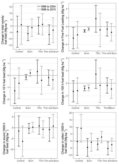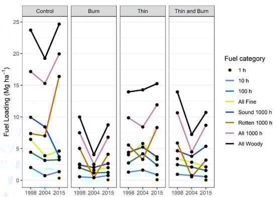 Fine fuel loading was examined as a combination of 10 h and 100 h fuel loading. The burn-only treatment showed an estimated 0.96 Mg ha−1 reduction in mean fine fuel loading between 1998 and 2004 (Table A3, Figure 4). Sound 1000 h fuel loading did not display a statistically significant change in any of the treatments 4–6 years post-treatment (Figure 4). Although all active treatments showed decreases in mean rotten 1000 h fuel loading 4–6 years post-treatment, only the thin and burn combination reached statistical significance, with a decrease of 5.31 Mg ha−1 (Table A3).