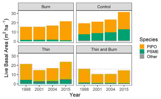 Change in tree species basal area by treatment over time. PIPO is ponderosa pine, PSME is Douglas-fir, and Other includes grand fir, larch, lodgepole pine, and Engelmann spruce. Each treatment is the average of 4 treatment units. The dashed line represents the target BA of 16 m2 ha−1. Thinning took place in 1998 after the initial measurement, and burning occurred in 2000.