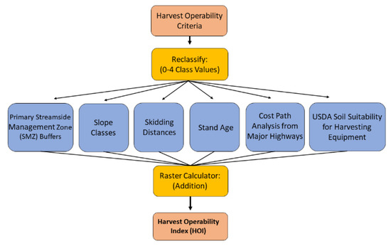 In their GIS analysis, Hogland and others [54] used Forest Inventory and Analysis (FIA) plot data, function modeling, and NAIP datasets to estimate Basal Area per Acre (BAA), Aboveground Biomass (AGB), and Trees per Acre (TPA) across 8 million hectares. Using these techniques could also improve the use of the HOI model. Managers may not have access to extensive forest stand age data and substituting the stand age data criterion for a BAA or TPA criterion could alleviate this dilemma. Additionally, estimating BAA or TPA may be more valuable for managers. In the reclassification of class values, managers could define their own 0–4 scale class value metrics based on regional harvesting demands and/or quotas. Lastly, modeling of predicted BAA, TPA, or AGB could be more representative of the actual board feet within a stand as stand age in the HOI model is a surrogate for a timber volume assessment. However, this technique requires more data layers to be acquired and further GIS analysis with landcover classification and regression analysis to create the BAA, TPA, or AGB layers- thus creating more time devoted to data criterion construction. A simpler approach, if the data is available, would be to retain the stand age HOI data criterion or use stand volume/basal area from forest stand inventory data.