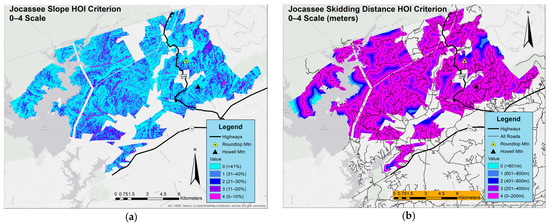 The Skidding Distance HOI criterion served as a metric in the HOI for defining the most operable (in terms of machine productivity), and therefore most likely cost-effective, distances for a wheel-based skidder. Our road layer used for the Skidding Distance HOI Criterion included a shapefile from US Census TIGER/Line® road shapefiles for Pickens Co. [42], merged with a Jocassee access road shapefile obtained from Jocassee staff. A Spatial Analyst Euclidean Distance Tool, using the shapefile of merged roads as its source input, then calculated distance in meters from the merged road shapefile. Our modeling initiatives assumed skidders are allowed to move freely throughout forest stands from starting points along the road network. The Euclidean distance output was then reclassified following metrics for optimal skidding conditions found in literature, with 0–200 m from a road representing the highest value (4 class value) [28,29,43]. Subsequent break classes used a 200 m interval to define decreasing skidding distance suitability, with >800 m receiving the lowest value (0 class value) (Table 3) due to substantially decreased machine productivity [44].