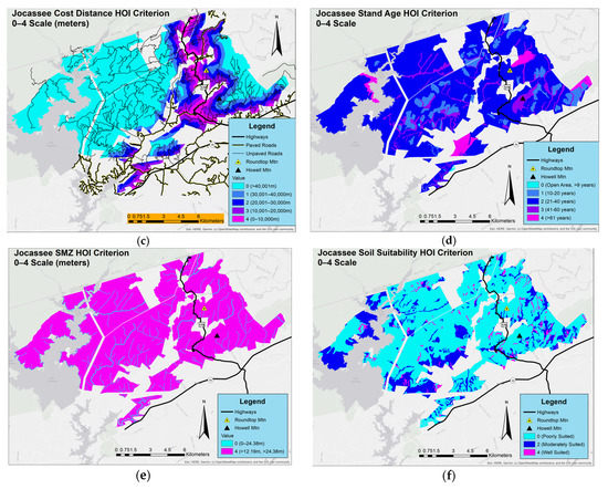 HOI criteria outputs on a 0–4 scale for Jocassee: (a) Slope HOI criterion; (b) Skidding Distance HOI criterion; (c) Cost Distance HOI criterion (d) Stand Age HOI criterion (e) SMZ HOI criterion (f) Soil Suitability HOI criterion.