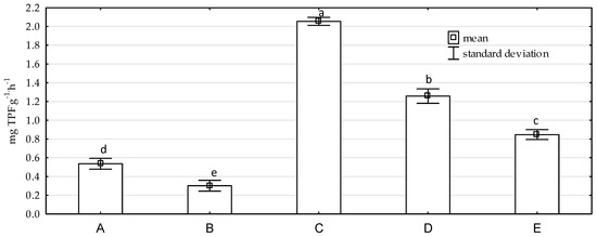 Activity of DHA in soil; A, B, C, D, E—explanations as in Table 1. The same lowercase letters above each column indicate that the average values of DHA activity (homogeneous group) are not significantly different at p < 0.001.