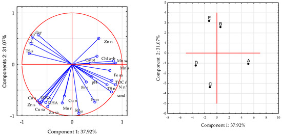 Configuration of variables in the system of the first two axes PC1 and PC2 of principal components. TOCs—total organic carbon in soil, SO42−—sulphate sulphur in soil, DHA—dehydrogenase activity, TSs—total S in soil, Cus—total Cu in soil, Fes—total Fe in soil, Mns—total Mn in soil, Zns—total Zn in soil, Cusa—available Cu in soil, Fesa—available Fe in soil, Mnsa—available Mn in soil, Znsa—available Zn in soil, TNn—total N in pine needles, TOCn—total organic carbon in pine needles, TSn—total S in pine needles, Cun—total Cu in pine needles, Fen—total Fe in pine needl, Mnn—total Mn in pine needles, Znn—total Zn in pine needles, Chl a+b — total chlorophyll content in pine needles, Carot—carotenoids in pine needles; A—Białe Błota, B—Belma Electomechanical Plant, C—Zachem Chemical Plant, D—The Zbigniew Załuski Park, E—The Forest Park of Culture and Recreation.