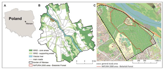 - Plan Ochrony Rezerwatu Las Bielański i Obszaru Natura 2000 PLH 140041 “Las Bielański”. Zarządzenie RDOŚ w Warszawie z Dnia 22 Września 2016 r. Dz.Urz. Woj. Mazowieckiego, 26 Poz. 8575 [Protection Plan of Nature Reserve Bielański Forest and the Nature 2000 Area PLH 140041 “Bielański Forest”. Regulation of Regional Director for Environmental Protection of September 22, 2016. Official Journal of Mazowieckie Province 26, Position 8575]. Available online: http://bip.warszawa.rdos.gov.pl/zarzadzenie-regionalnego-dyrektora-ochrony-srodowiska-w-warszawie-z-dnia-22-wrzesnia-2016-r-publikowane-w-dzienniku-urzedowym-wojewodztwa-mazowieckiego-poz-8575 (accessed on 5 June 2021).
