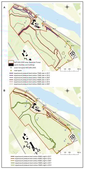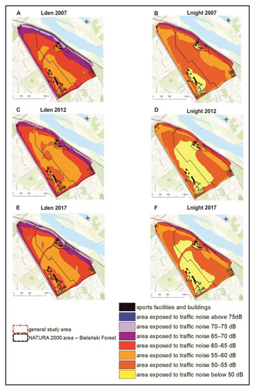 - the expansion of the area of the 50 dB noise band in the period 2012–2017 was also stable, especially in the northern and southern part of the NATURA 2000 site; in 2007, there were no areas exposed to noise levels below 50 dB.