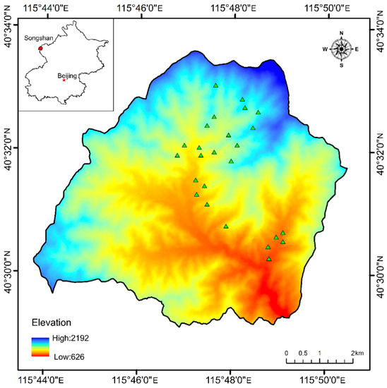 This study was conducted in the Songshan Nature Reserve (40°29′9″–40°33′35″ N, 115°43′44″–115°50′22″ E) northwest of Beijing, a typical rocky mountainous area of North China. The total area of the nature reserve is 4671 ha, having an elevation of 627–2984 m. The study site has a typical temperate continental climate with an average annual temperature of 8.5 °C and annual precipitation of 493 mm. This area is a warm-temperate mountain ecosystem with a well-preserved natural ecological environment in North China. It was reported that this area has 721 species of wild plants in 382 genera belonging to 92 families [39]. Natural secondary forests are distributed below an elevation of 1800 m, and the soil type is mainly brown loam. The main tree species in this area include Quercus mongolica, Populus davidiana, Fraxinus rhynchophylla and Betula dahurica.