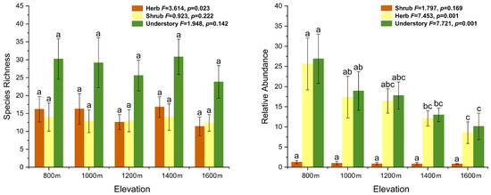Species richness and relative abundance of understory plants at different elevations. Significant differences (p < 0.05) among different elevations were indicated by different lowercase letters (ANOVA, Tukey range test). Shrub, shrubby plants (including tree seedlings and vines); understory, shrub and herb.