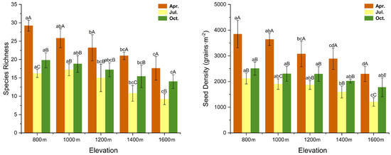 Species richness and seed density dynamics in the soil seed banks at different elevations and seasons. Different lowercase letters indicate significant differences (p < 0.05) among different elevations in the same season, and different uppercase letters indicate significant differences (p < 0.05) among different seasons at the same elevation (ANOVA and Tukey range test).