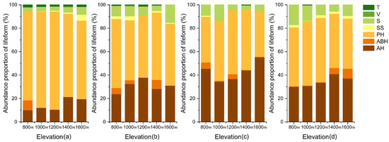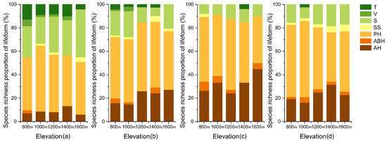 Species richness proportion of lifeform in understory vegetation (a) and soil seeds in April (b), July (c) and October (d) with elevation. T = tree, V = vine, S = shrub, SS = semi-shrub, PH = perennial herb, ABH = annual–biennial herb, AH = annual herb.