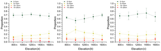 The proportion of seed bank density at different depths in the soil profile (0–20 cm) with elevation in April (a), July (b) and October (c).