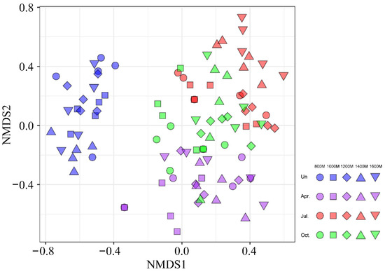 Two-dimensional nonmetric multidimensional scaling (NMDS) ordination of understory vegetation and seed banks along an elevational gradient (800, 1000, 1200, 1400 and 1600 m) in April, July and October (stress value = 0.1901). The marks change with the seasons, and the colors represent understory vegetation and seed banks during different seasons (Un—understory).