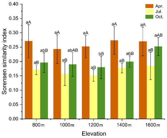 The Sørensen similarity index of different elevations and seasons. Different lowercase letters indicate significant differences (p < 0.05) among different elevations in the same season, and different uppercase letters indicate significant differences (p < 0.05) among different seasons at the same elevation (ANOVA and Tukey range test).