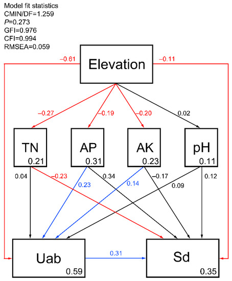 SEM showing the effects of the explanatory variables on species richness and density of the soil seed bank. A causal relationship is represented by arrows. Only the paths with significant influence (p < 0.05) are shown to simplify the graph. Multiple R2 are shown in the box of the respective response variable. Significant positive effects are indicated by blue lines and significant negative effects are indicated by red lines. Insignificant effects are indicated by black lines. TN—total nitrogen; AP—available phosphorus; AK—available potassium; Uab—abundance of understory vegetation; Sd—soil seed banks density.