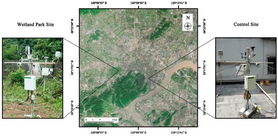 In this study, Xixi National Wetland Park in China was selected as the target site. Xixi National Wetland Park (30°15.39′ N–30°16.96′ N, 120°03.16′ E–120°04.94′ E) is 16 km from the downtown area of Hangzhou, China. As a typical urban wetland park and China’s first national wetland park, Xixi National Wetland Park was established by the State Forestry and Grassland Administration (formerly the State Forestry Administration) of China in 2005 [24]. It has a total area of 11.5 km2, and over 50% of its surface is covered by water. The park has a typical humid subtropical monsoon climate with high temperatures and precipitation in summer, and low precipitation in winter. The average temperature is about 16.2 °C, and the average precipitation is about 1400 mm per year. Xixi National Wetland Park consists of three areas: the wetland ecological protection and cultivation area (east), the wetland eco-tourism leisure area (center), and the wetland ecological landscape conservation area (west). As shown in Figure 1, the wetland park site (WPS) and the control site (CS) are in the ecological protection and cultivation area and the downtown area of Hangzhou, respectively. When the positioning monitoring platform used in this study was installed, the destruction of vegetation around the site was minimized. After installation, the original vegetation was reconstructed. Excluding the presence of protective measures, such as a guardrail installed around the site, there is no man-made shade or open space to prevent the modification of wind flow and the limiting of heat dissipation. The CS is not shaded by nearby buildings, and is not affected by wind channelling, downdraft effects, etc. Thus, the microclimate characteristics of the regions represented by the two platforms are objectively reflected.