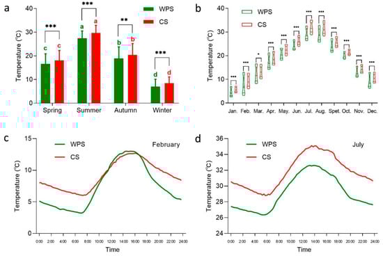 The seasonal, monthly, and daily variations of the average temperature in the WPS and CS. (a) The seasonal variation of the average temperature; different lowercase letters of the same color indicate results of a one-way ANOVA followed by Tukey’s test (p < 0.05), and error bars represent the standard deviation. (b) The monthly variation of the average temperature. (c) The daily variation of temperature in February. (d) The daily variation of temperature in July. Note: Significant differences between the means of WPS and CS were determined using Student’s t-test (* p < 0.05, ** p < 0.01, *** p < 0.001).