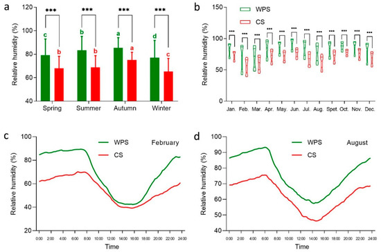 The seasonal, monthly, and daily variations of the average relative humidity in the WPS and CS. (a) The seasonal variation of the average relative humidity; different lowercase letters of the same color indicate results of a one-way ANOVA followed by Tukey’s test (p < 0.05), and error bars represent the standard deviation. (b) The monthly variation of the average relative humidity. (c) The daily variation of relative humidity in February. (d) The daily variation of relative humidity in August. Note: Significant differences between the means of WPS and CS were determined using Student’s t-test (*** p < 0.001).