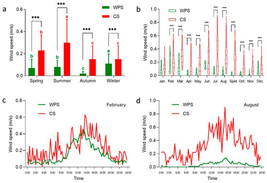 The seasonal, monthly, and daily variations of the average wind speed in the WPS and CS. (a) The seasonal variation of the average wind speed; different lowercase letters of the same color indicate results of a one-way ANOVA followed by Tukey’s test (p < 0.05), and error bars represent the standard deviation. (b) The monthly variations of the average wind speed. (c) The daily variation of wind speed in February. (d) The daily variation of wind speed in August. Note: Significant differences between the means of WPS and CS were determined using Student’s t-test (*** p < 0.001).