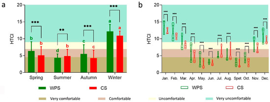 As shown in Figure 5a, the HTCI in both the WPS and CS demonstrated certain seasonal variations. Apart from summer, when the HTCI in the WPS was significantly lower than that in the CS (p < 0.01), the HTCI in the WPS was higher than that in the CS in the other seasons (p < 0.001). From the seasonal perspective, significant variations of the HTCI in the WPS between all seasons was observed (p < 0.05). The largest variation occurred in winter (12.17), which could be classified as a very uncomfortable feeling. The lowest variation occurred in summer (4.34), which could be classified as a very comfortable feeling. The variations in spring (6.38) and autumn (5.49) had a middle rank, which could be classified as a comfortable feeling. In the CS, the largest variation occurred in winter (10.90), which could be classified as a very uncomfortable feeling, the lowest variation occurred in autumn (4.26), which could be classified as a very comfortable feeling, and the variations in spring (5.09) and summer (4.86) had a middle rank, which could be classified as a comfortable feeling. The difference between spring and summer was not substantial, but their difference with winter and autumn was significant (p < 0.05).